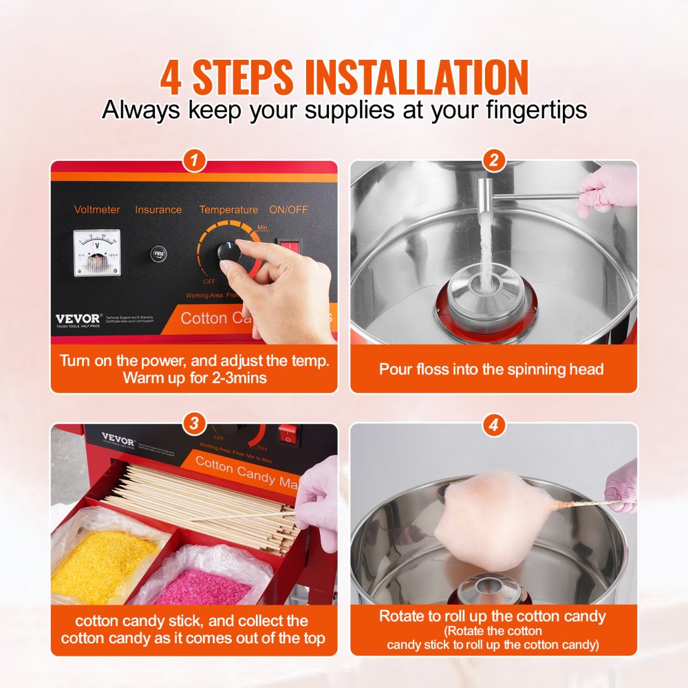 Snadná obsluha: Používání tohoto stroje nemůže být jednodušší. Zapněte napájení, nastavte teplotu, nechte 2–3 minuty zahřívat, nasypte cukr do rotující hlavy a poté už jen stačí pomocí tyčinek sebrat cukrovou vatu z hlavy.