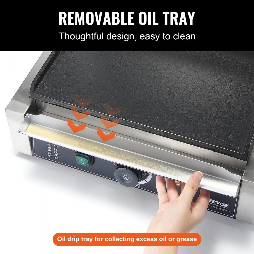 Snadné čištění: Tento sendvičovač panini press je dodáván s odnímatelnou olejovou miskou pro snadný sběr použitého oleje a zbytků. Údržba je jednoduchá pomocí škrabky a suchého hadříku. Vícenásobné větrací otvory na obou stranách účinně odvádějí teplo a pomáhají udržovat rozumnou teplotu přístroje.