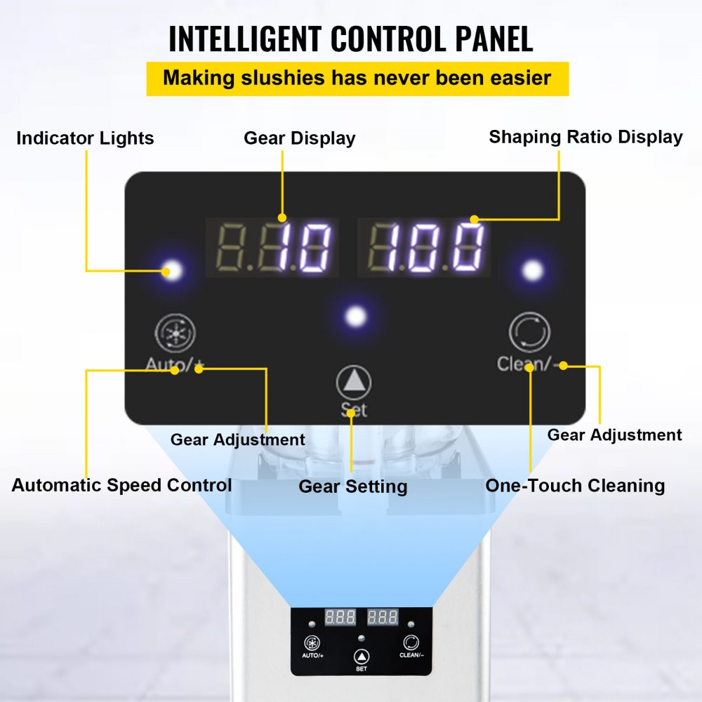 Přesné ovládání: Stručný ovládací panel slibuje snadné použití komerčního stroje na ledovou kaši. Jednoduchým ovládáním jedním dotykem budete mít svůj oblíbený mražený nápoj připravený k vychutnání. Dva digitální displeje vám na první pohled zprostředkují přehled o stavu převodového stupně a tvarovacím poměru. Pro úsporu námahy je k dispozici také automatický režim čištění.