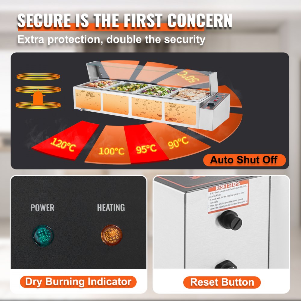 Obsahuje 4 pánve: Náš komerční ohřívač jídla se dodává se čtyřmi pánvemi o objemu 8 qt (velikost 4*1/2) s příslušnými víky, což vám umožní servírovat různá jídla současně. Nebojte se změnit své menu z polévek a omáček na dušené maso nebo dokonce nachos sýr s čokoládou.