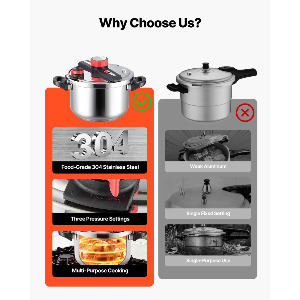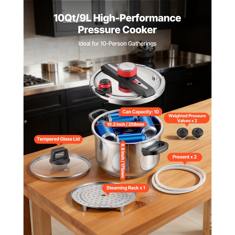 Tlakový hrnec VEVOR, 9l tlakový hrnec z nerezové oceli, tlaková nádoba s napařovacím roštem, víko z tvrzeného skla, tři nastavení tlaku pro maso, fazole, rýži, polévku, omáčky, vaření až do 100 kPa