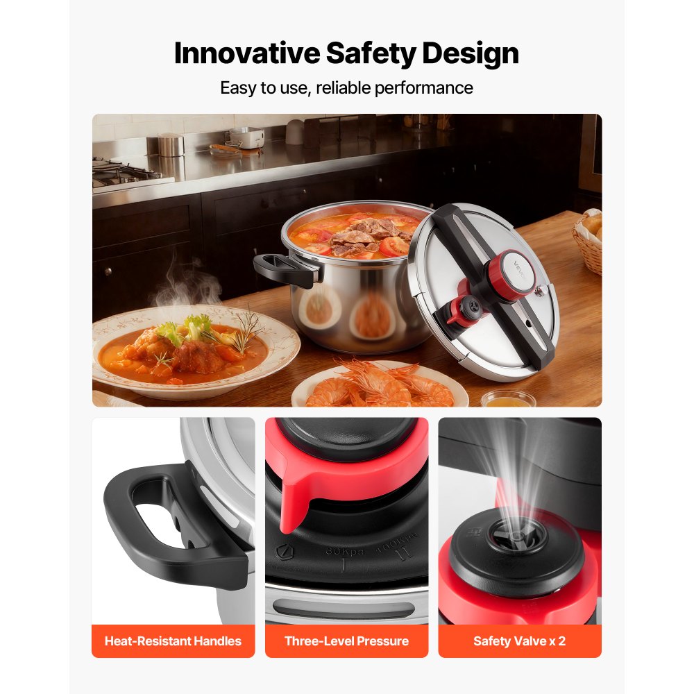 Design tři v jednom: Tlakový hrnec s objemem 10 qt/9 l v sobě spojuje hrnec na polévku, napařovací rošt a tlakový režim. Vyberte si manuální uvolnění, 60 kPa nebo 100 kPa podle vašeho pokrmu, což umožňuje rychlé a rovnoměrné vaření, které pomáhá zachovat přirozenou chuť a klíčové živiny i pod vysokým tlakem.