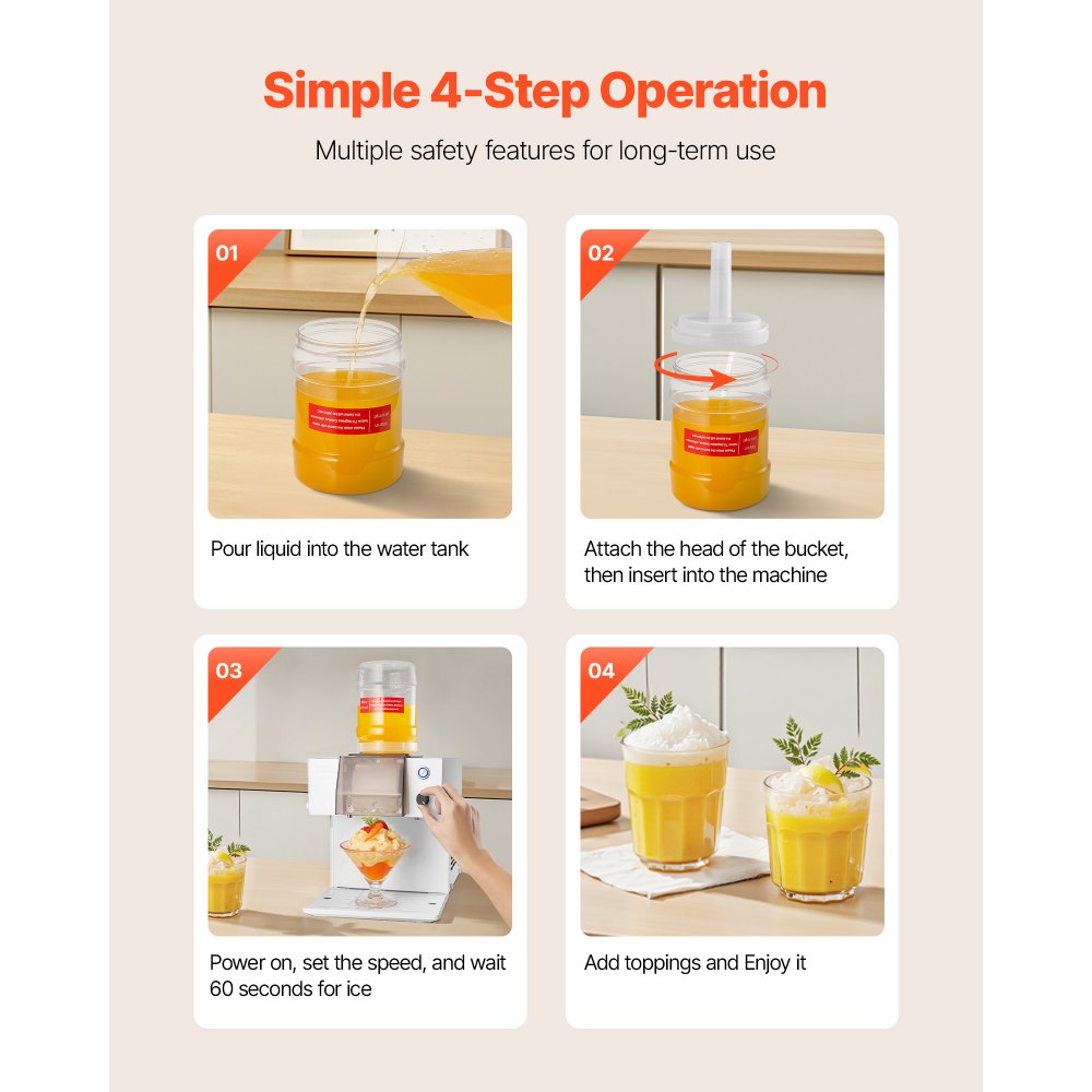 Nastavitelné rychlosti 0–100: Díky nastavitelným rychlostem 0–100 vám tento výrobník ledu ve formě sněhových vloček umožňuje vytvářet různé textury, jako je nadýchaný led ve formě sněhových vloček, tenké proužky, led ve tvaru nudlí nebo vločky, a pokaždé vám tak zajistí hladké a osvěžující dezerty.