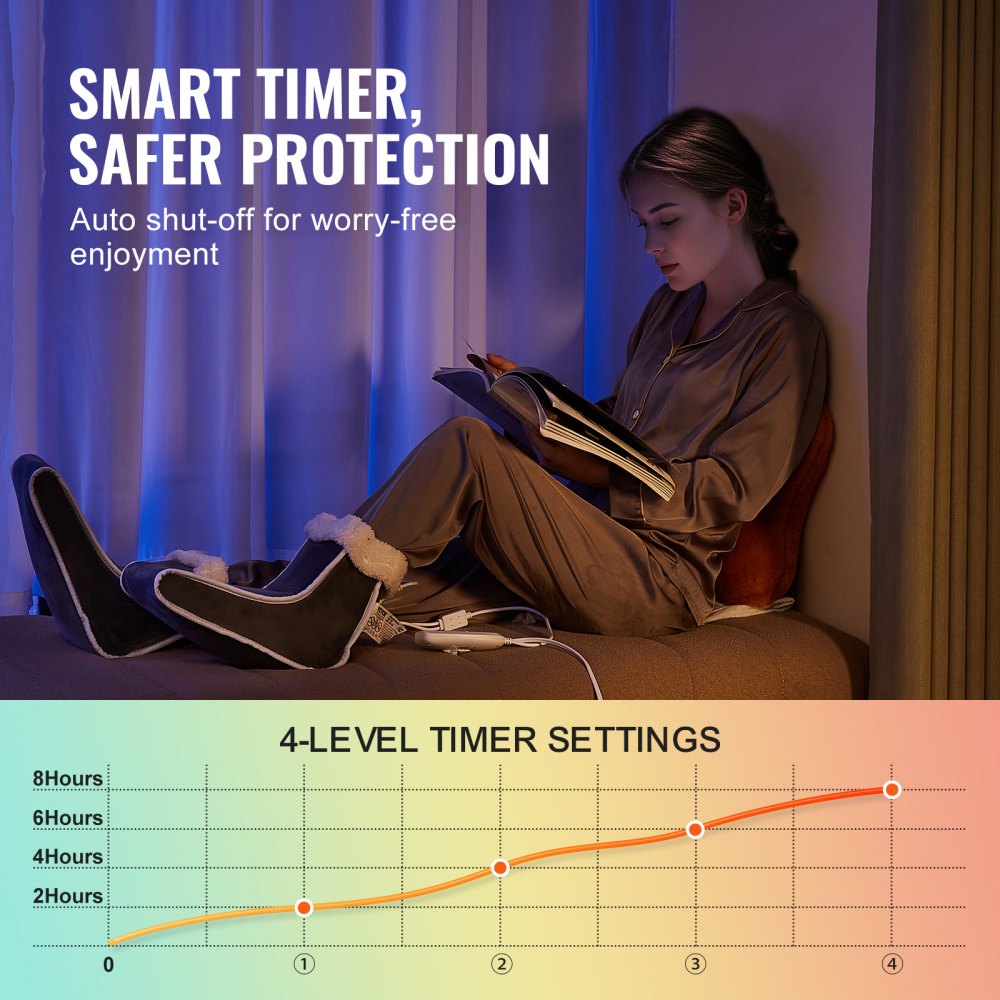 Vylepšená bezpečnost: Elektrický ohřívač nohou s automatickým vypnutím je vybaven 4úrovňovým inteligentním časovačem (2, 4, 6 nebo 8 hodin), který zabraňuje nadměrnému používání nebo zapomenutí na vypnutí. Navíc vestavěná ochrana proti přehřátí vám umožní užívat si příjemné teplo s klidem.