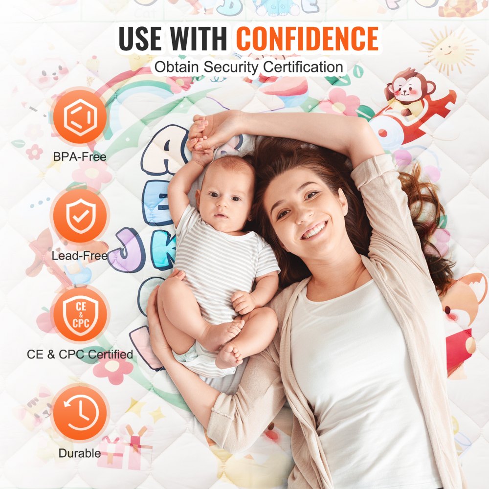Odolná a dlouhá životnost: Podložka je vyrobena z bezpečných materiálů uvnitř i vně. Splňuje certifikace CPC a CE a prochází testy ASTM a EN71-1/2/3, což zajišťuje její bezpečnost, i když ji vaše dítě žvýká. Materiál je také odolný proti opotřebení a trvanlivý, dítě ho snadno nepoškrábe ani nepoškodí.