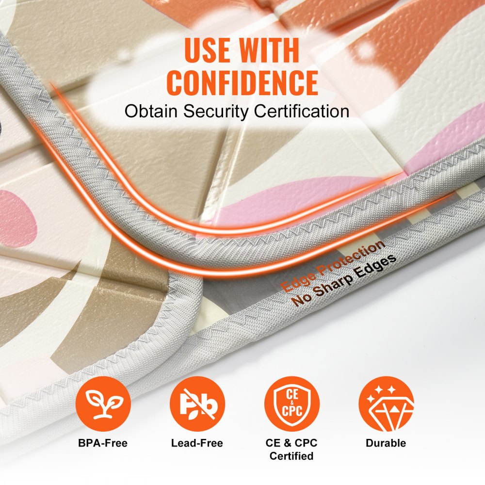 Odolná a dlouhá životnost: Prioritou je zdraví a bezpečnost vašeho dítěte. Materiál je bezpečný pro přímý kontakt, splňuje certifikace CPC a CE a prošel testy ASTM a EN71-1/2/3, což zajišťuje růst a ochranu vašeho dítěte. Okraje jsou potaženy netkanou textilií, která zabraňuje protržení fólie rohože žvýkáním dítěte, a prodlužuje tak její životnost. Povrch může být propíchnut ostrými předměty, proto na podložku nepokládejte hračky, pera ani předměty s ostrými hranami.