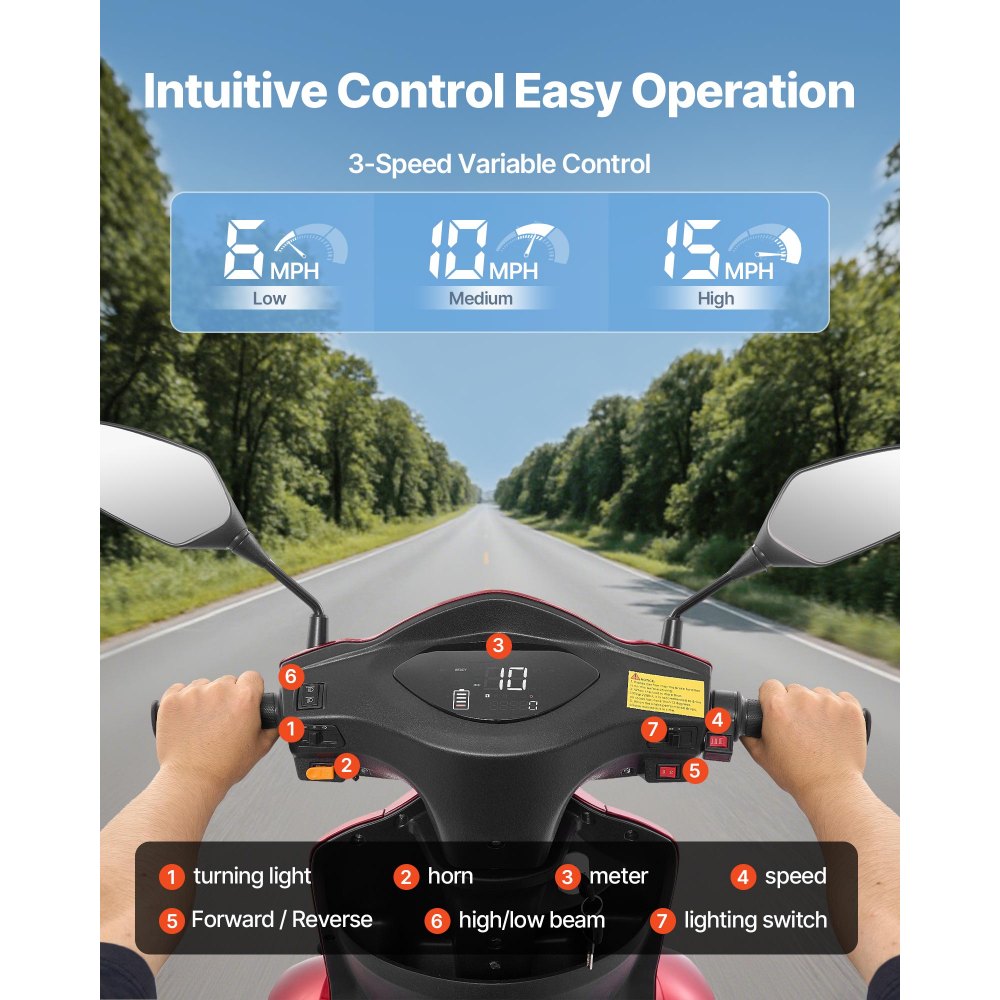 Flexibilita 3 rychlostí: Naše elektrická rekreační koloběžka nabízí tři nastavitelné rychlostní režimy (6 mph / 10 mph / 15 mph), což vám umožní přizpůsobit se potřebám. Ať už se jedná o nákupy nebo vyjížďky po vyhlídkách, je to ideální volba pro seniory. Přístrojová deska jasně zobrazuje rychlost, počet najetých kilometrů a stav baterie v reálném čase.