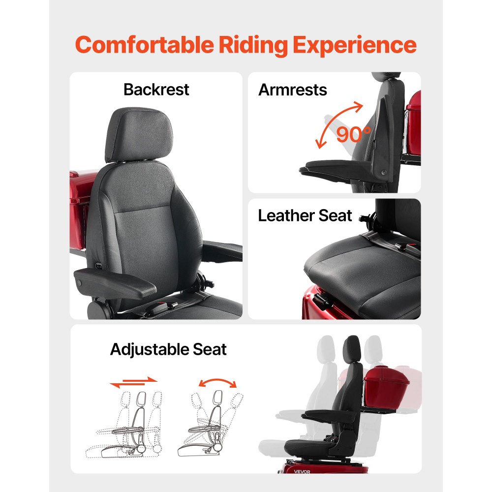 Pohodlný design: Tato odolná koloběžka pro dospělé je vybavena opěradlem, které lze nastavit dopředu a dozadu, a poskytuje tak dostatek prostoru pro nohy. Pro větší pohodlí a oporu je vybavena také opěrkou hlavy. Obě loketní opěrky lze zvednout nebo sklopit dozadu pro snadné nastupování a vystupování. Zadní úložný prostor a přihrádka v palubní desce poskytují praktický prostor pro každodenní výlety a nákupy.