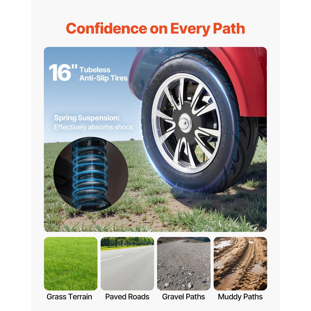 Stabilní jízda: Naše odolná čtyřkolová koloběžka je poháněna dobíjecí olověnou baterií 60 V 20 A, která poskytuje dlouhotrvající výkon s dojezdem až 35 km na jedno nabití. Pneumatiky s hlubokým vzorkem bez nafukování usnadňují jízdu a zvyšují její stabilitu, zatímco přední a zadní pružinové odpružení absorbuje nárazy, zajišťuje vyváženou jízdu a pomáhá vám snadno dosáhnout cíle.