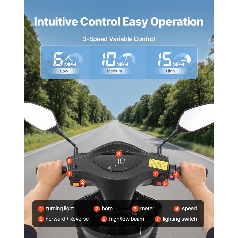 Flexibilita 3 rychlostí: Naše elektrická rekreační koloběžka nabízí tři nastavitelné rychlostní režimy (6 mph / 10 mph / 15 mph), což vám umožní přizpůsobit se potřebám. Ať už se jedná o nákupy nebo vyjížďky po vyhlídkách, je to ideální volba pro seniory. Přístrojová deska jasně zobrazuje rychlost, počet najetých kilometrů a stav baterie v reálném čase.