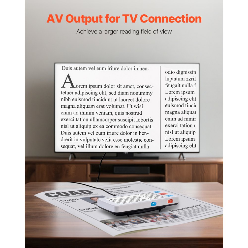Zlepšená viditelnost: Tato elektronická čtecí pomůcka je vybavena AV výstupem a lze ji připojit k televizoru pro větší a jasnější obraz. Tato konstrukce umožňuje zobrazování obrázků na větší obrazovce pro lepší viditelnost, což usnadňuje a zpříjemňuje čtení, psaní a prohlížení obrázků.
