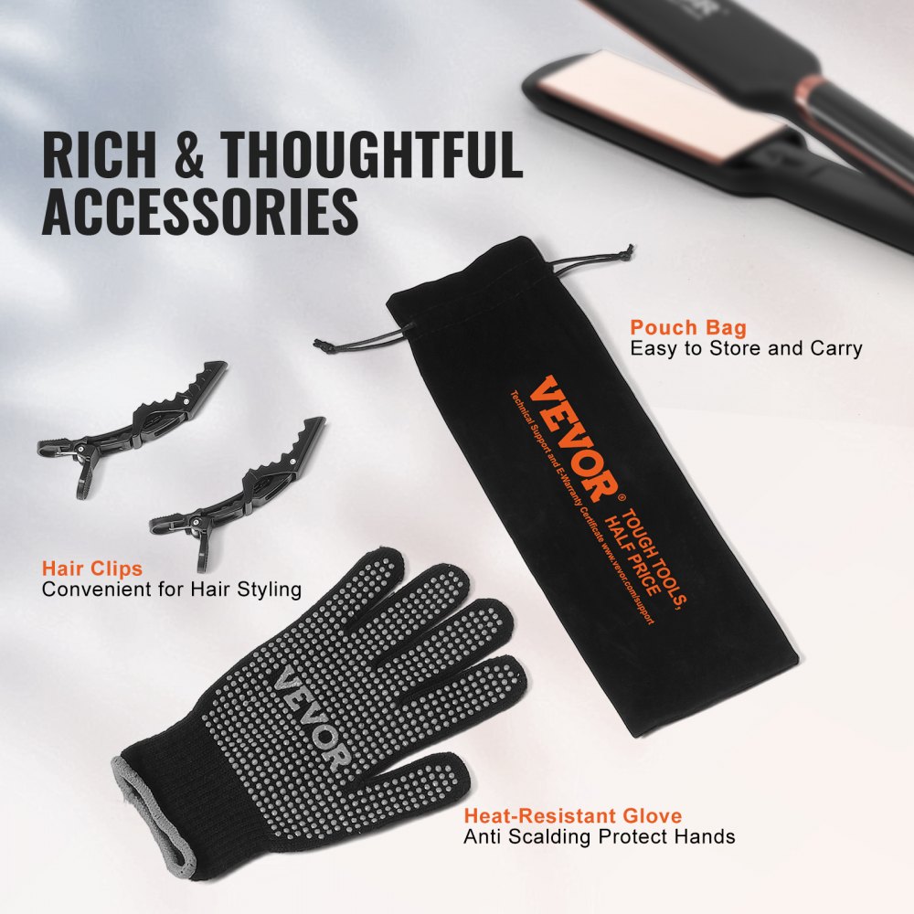 Promyšlené příslušenství: Součástí balení jsou sponky do vlasů, které bezpečně drží vlasy na místě pro rychlé a efektivní úpravu, a žáruvzdorná rukavice poskytuje vašim rukám dodatečnou ochranu. Sametové pouzdro navíc umožňuje pohodlné skladování a přenosnost, takže si žehličku na vlasy můžete snadno vzít kamkoli s sebou.