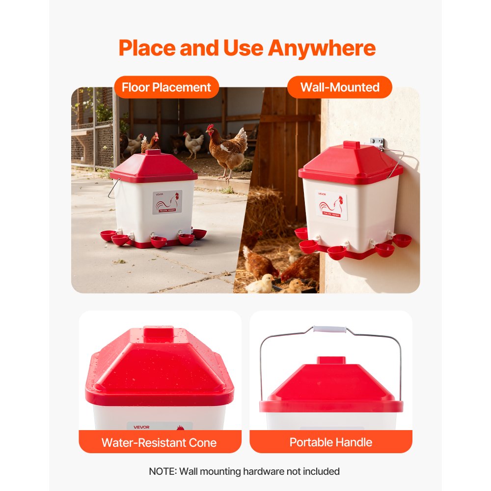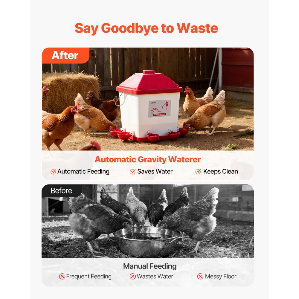 Čistá voda, méně odpadu: Rozlučte se s rozptýlenou vodou! Tato automatická napáječka pro kuřata udržuje váš kurník uklizený, snižuje plýtvání vodou a šetří náklady. Špičatý, vodotěsný vršek zabraňuje hromadění deště, takže napáječka je suchá a čistá.