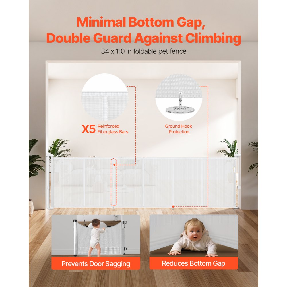 Zatahovací design: Tato bílá síťovaná brána se dá roztáhnout až do šířky 280 cm a výška pletiva je 86 cm, což vám umožňuje dle potřeby upravit velikost otvoru. Zatahovací design usnadňuje skladování, když se nepoužívá, zabírá minimum místa a udržuje váš domov uklizený a prostorný.