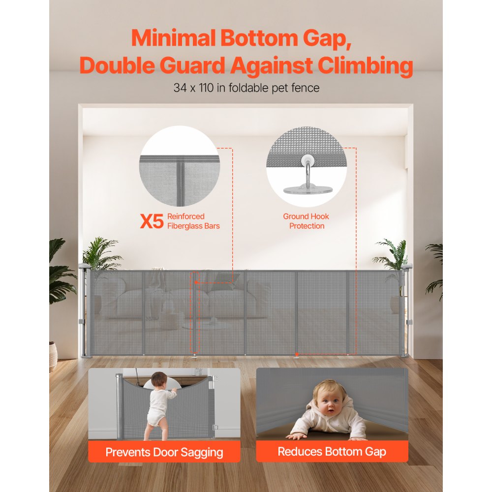 Zatahovací design: Tato šedá síťovaná brána se dá roztáhnout až do šířky 280 cm a výška pletiva je 86 cm, což vám umožňuje dle potřeby upravit velikost otvoru. Zatahovací design usnadňuje skladování, když se nepoužívá, zabírá minimum místa a udržuje váš domov uklizený a prostorný.