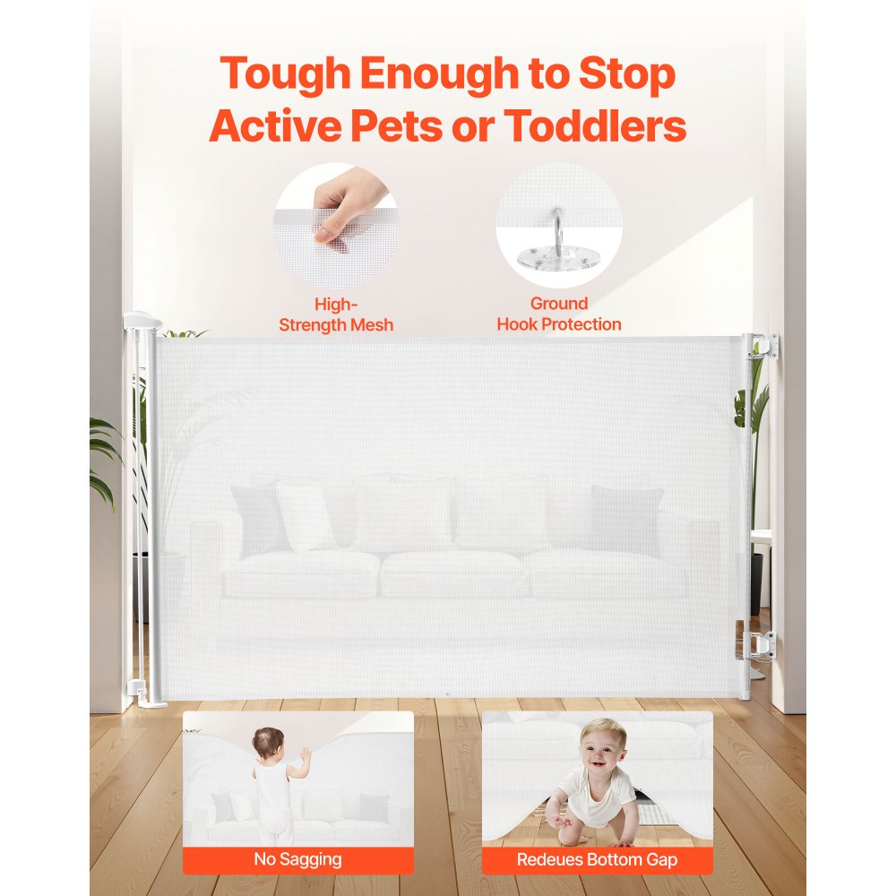 Zatahovací dětská zábrana VEVOR, roztažitelná na šířku 1450 mm, výšku 980 mm, s bezpečnostním zámkem, snadné použití, průchod bez zakopnutí, síťovaná zábrana pro psy na schody, do chodeb, pro vnitřní i venkovní použití, bílá | Zemědělské a lesnické stroje | Originalnitextil.cz